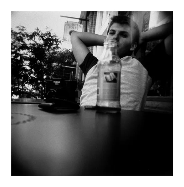 My good friend Daniel, photographed with a Holga resting on the table. I took this shot while we took a break from walking during a shooting expedition around Savannah with our Holgas (you can see his resting on the table in front of him).